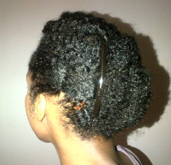 My frow-hawk from Curlvolution was looking a bit dry so I turned it into this style. I’m giving my hair a break from small flat twists but two large ones shouldn’t hurt 🙂 This style should hold for a couple of days.